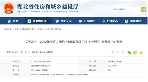 (通讯员:杨杰、黄锋、王长青)9月7日,湖北省住房和城乡建设厅发布《关于2021-2022年度第二批湖北省建设优质工程(楚天杯)获奖单位的通报》,中建科工集团有限公司承建的武汉蔡甸经济开发区奓山街产城融合示范新区一期项目8#楼名列其中,荣获湖北省建设优质工程“楚天杯”奖,成为中建科工华中大区首个获得此项殊荣的装配式钢结构住宅项目,标志着该项目在工程质量、施工管理、建筑功能等方面达到了省级先进水平。