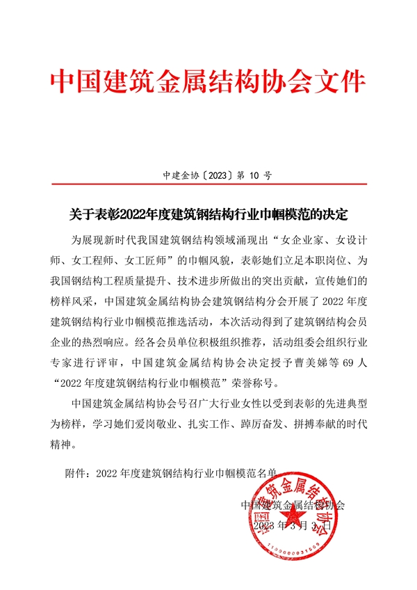 (通讯员:杨杰、黄锋)3月,中国建筑金属结构协会在全国建筑钢结构行业中开展了“巾帼模范”评选活动,旨在展现新时代我国建筑钢结构领域涌现出的“女企业家、女设计师、女工程师、女工匠”的巾帼风貌,表彰她们立足本职、爱岗敬业、为钢结构工程管理水平提升、技术进步所做出的突出贡献。中建科工华中大区推荐的四名巾帼人选,逐鹿群雄,以优秀的业绩脱引而出,荣获全国建筑钢结构行业“巾帼模范”人物荣誉称号,获得殊荣的四人分别是:中建科工集团武汉公司综合办主任邹晓晶、中建科工集团武汉公司质量管理聂祖蓉、中建科工集团华中大区综合办经理助理许娴、中建科工集团华中大区科技与设计管理部经理助理钟姗。