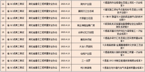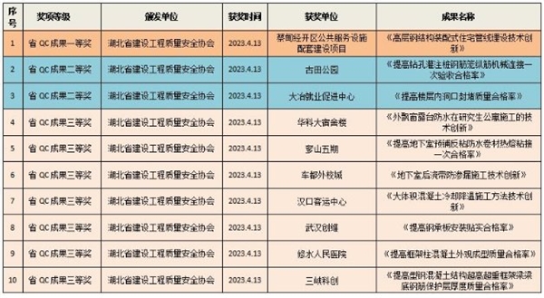 (通讯员:杨杰、黄锋)春风送暖、捷报频传!4月13日,湖北省建设工程质量安全协会发布2023年湖北省工程建设优秀QC成果比赛结果,中建科工华中大区申报的20项QC成果全部获奖,其中一等奖1项、二等奖2项、三等奖17项。中建科工华中大区积极组织质量管理小组活动开展、评审及发布交流等活动被评为湖北省2023年度QC小组活动优秀组织单位。