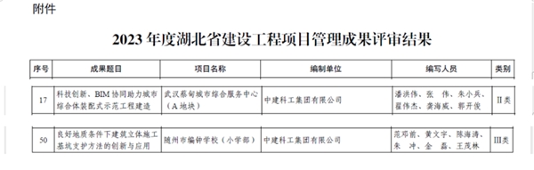 5月30日,湖北省建设工程质量安全协会发布2023年度湖北省建设工程项目管理成果评审结果,中建科工蔡甸城市综合服务中心项目申报的《科技创新、BIM 协同助力城市综合体装配式示范工程建造》、中建科工随州编钟小学申报的《良好地质条件下建筑立体施工基坑支护方法的创新与应用》两项成果,分别获得湖北省建设工程项目管理成果Ⅱ类成果奖、Ⅲ类成果奖。