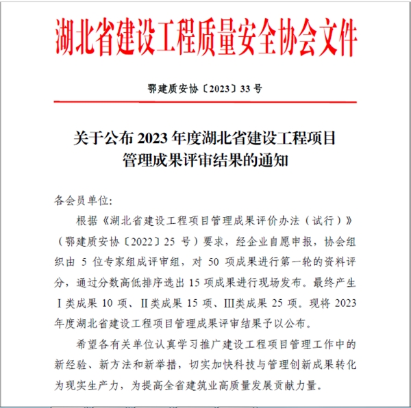 据悉,本次评比的成果是经过企业申报,各地市和有关行业协会的审核推荐,湖北省建设工程项目管理成果评审专家审定,共有50项成果获得湖北省建设工程优秀项目管理成果,其中Ⅰ类成果10项,Ⅱ类成果15项,Ⅲ类成果25项。湖北省建设工程项目管理成果由湖北省建设工程质量安全协会组织申报和评选,是湖北省工程建设领域内工程项目管理的最高奖项,分为Ⅰ、Ⅱ、Ⅲ类三个等级,旨在引领企业依靠技术进步与管理创新增强企业的发展,系统总结企业在开展建设工程项目管理工作中的新经验、新方法和新举措,切实加快科技与管理创新成果转化为现实生产力。