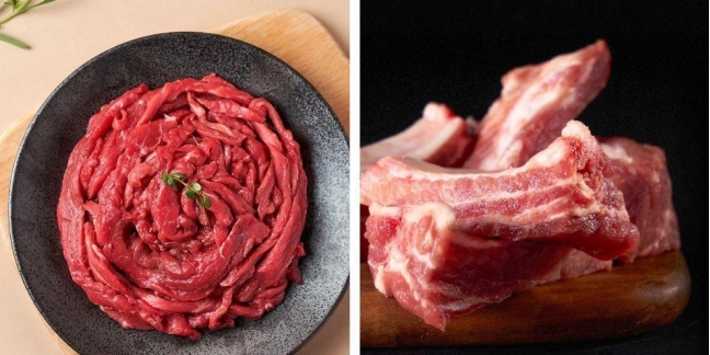 (左:冷鲜进口牛肉丝 ; 右:冷鲜黑猪肋排)