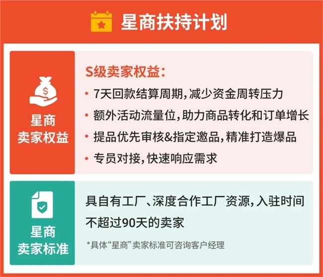 但现在,Shopee全托管为了加大新商扶持力度,助力新卖家依托全托管更快速实现起量,面向具有自有工厂、深度合作工厂资源的卖家开放“星商扶持计划”,新卖家有机会成为“星商”,在入驻的前3个月,无需根据《全托管卖家考核规则》从等级最低的“N级卖家”进行向上评级,直接享受“S级卖家权益”,获得更多流量曝光资源。
