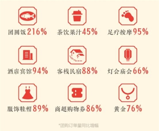 酒店宾馆团购量涨了94%,客栈民宿涨了88%,灯会庙会涨了66%,足疗按摩涨了95%,茶饮果汁涨了45%...